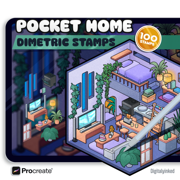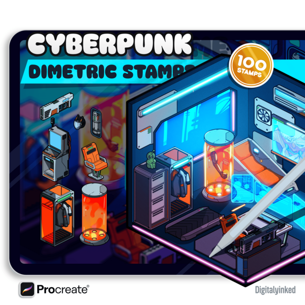 Dimetric Cyberpunk - Futuristic Bedroom Brush Stamps for Procreate • 2:1 Dimetric Room Builder • | Digital Download