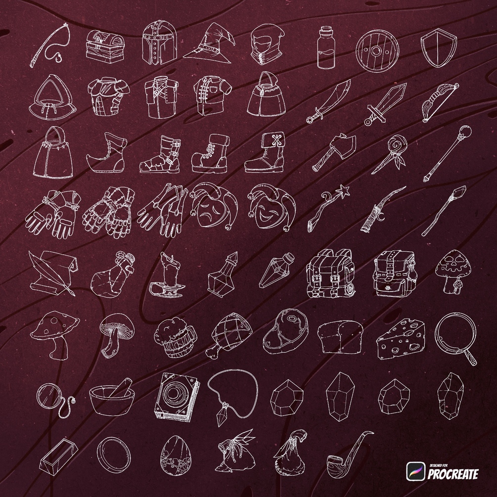 60 Fantasy Adventurer Stamps for Procreate and Photoshop – RPG Icons Design Brush Kit | INSTANT DOWNLOAD