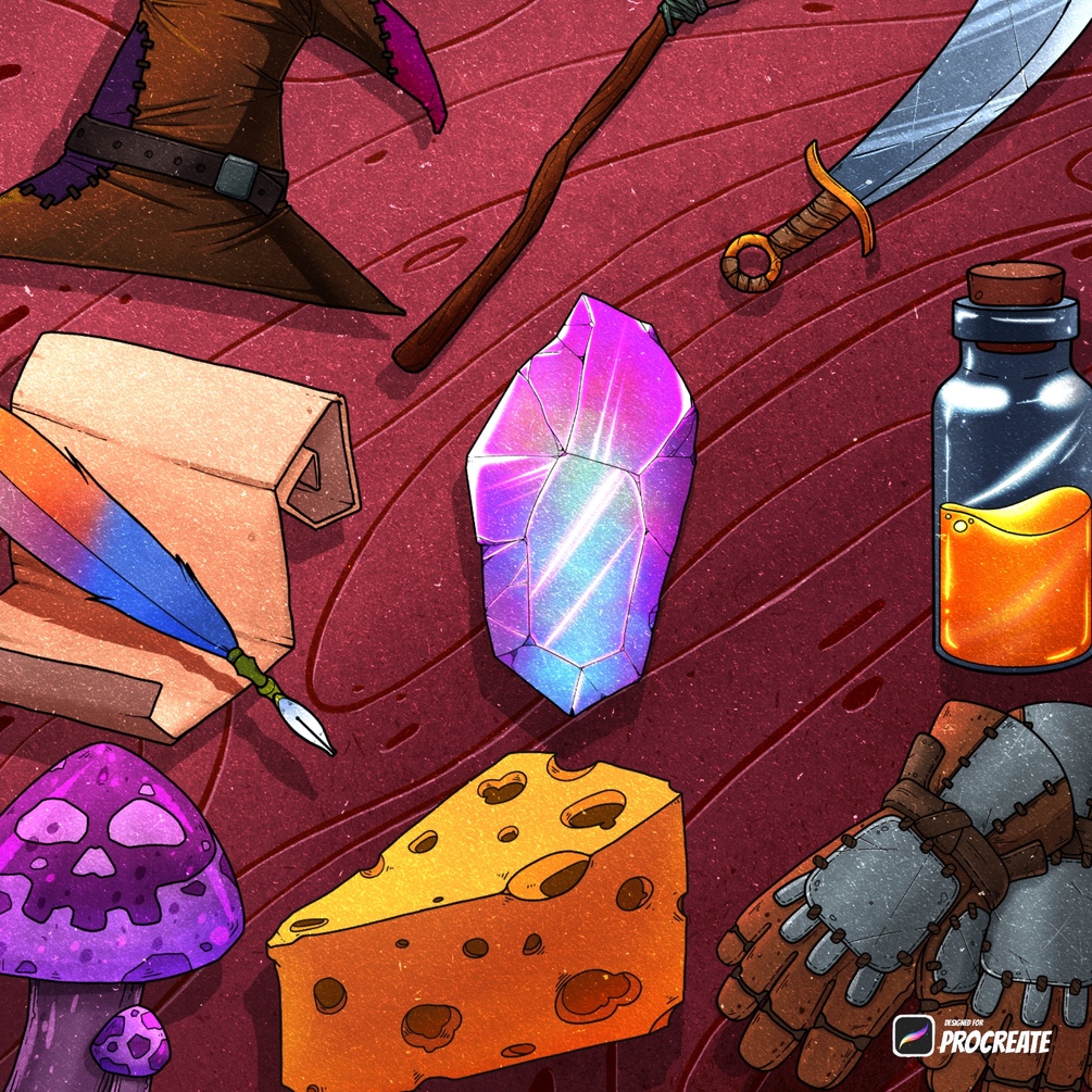 Level up your designs with this 60 Fantasy Adventurer Procreate Stamp Kit! This brush pack includes a variety of boots, gloves, swords, shields, wands, armor, and accessories to speed up your fantasy art workflow. Perfect for creating tabletop game assets, or fantasy illustrations on your iPad.